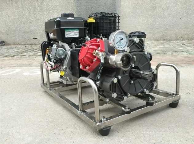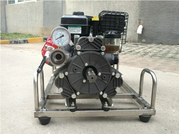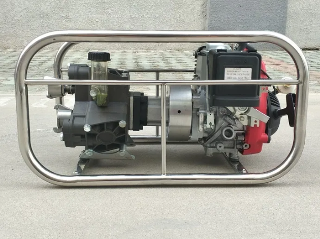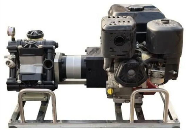 不锈钢架,便于携行。泵轴水平布置,减少震动。水泵泵体为柱塞液压隔膜泵。允许砂石颗粒通过,对水质要求低,对发动机功率损耗小。泵组可在横向、纵向倾斜达到25°时正常工作。水带直径25mm,爆破压力18MPa,表层涤纶长丝,内衬进口橡胶,高压森林接口连接。水泵配备的动力装置为强制风冷四冲程汽油机。我们的行星减速机通过特殊的处理方式,在发动机转数超过2000转的情况下,不会削弱发动机的动力,反而有助于发动机的动力,提高水泵的效率。
