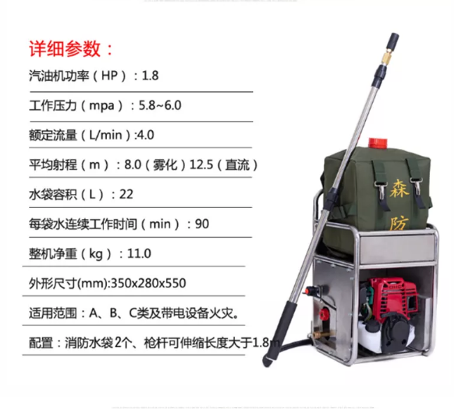 不锈钢架,便于携行。泵轴水平布置,减少震动 水泵泵体为柱塞液压隔膜泵。允许砂石颗粒通过,对水质要求低,对发动机功率损耗小。 泵组可在横向、纵向倾斜达到25°时正常工作。 水带直径40mm,爆破压力18MPa,表层涤纶长丝,内衬进口橡胶,高压森林接口连接。 水泵配备的动力装置为强制风冷四冲程汽油机。