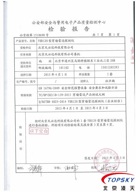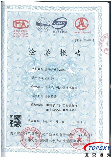 近日,北京天必达科技有限公司研发的YSR-120穿墙雷达探测仪通过公安部安全与电子产品检测检验中心检验,检测报告编号:公京检第1510698号。