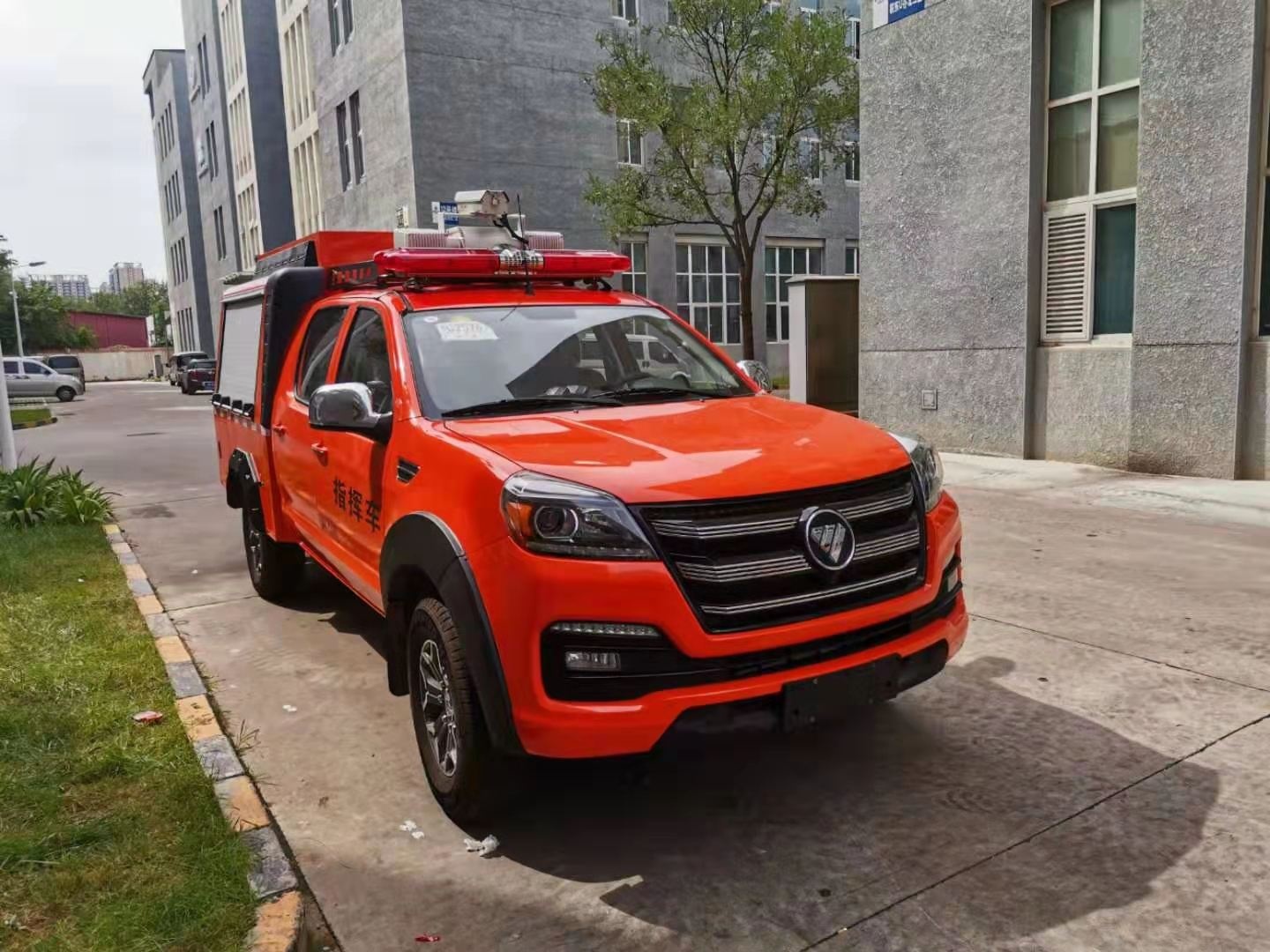 专门为特种机器人量身定做的一款机器人运输车,由皮卡车改装,区别于传统意义上大型运输车,体积更小,动力更足。车厢设计有升降照明系统,解决了救援现场能见度低的问题,1.2-1.8米升降高度,可满足不同照明需求。车体顶部装有4G图像传输系统,可将现场情况实时传输到指挥部,有利于指挥现场调度。配有一体化机器人装运梯,最大承压≥600Kg。后箱四周配有一圈小型照明系统,可用于晚间或光线昏暗等环境。后箱设计有独立储物架,可放置机器人配套设备。两侧卷闸窗设计方便拿用。