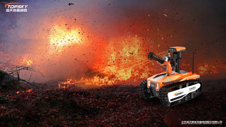 机器人采用无线遥控设计,遥控器与监视器一体/分离,可实时的显示电池、内部的各种信息,机器人状态、现场温湿度、有毒有害气体浓度报警信息等控制机器人前进、后退、转向等运动。具备远程侦察能力,机身搭建升降云台、高清摄像头、热成像摄像头、气体传感器三类环境感知设备和云台控制设备,也可联动声光报警模块提醒消防人员或群众,有效避免危险。在通过远程侦察手段有效获取现场火源信息后,机器人配备的大功率电机可以帮助消防人员将消防水袋拖拽至危险火源区域进行灭火,并能搭载各类国内、外的多种消防水泡,并能够远程控制发射水或泡沫。基于所配备的拾音模块和扬声器模块,拾取现场环境声音,即使消防官兵未靠近消防现场也能够听到搜救现场的群众呼救声,并通过扬声器模块与群众进行现场对话。