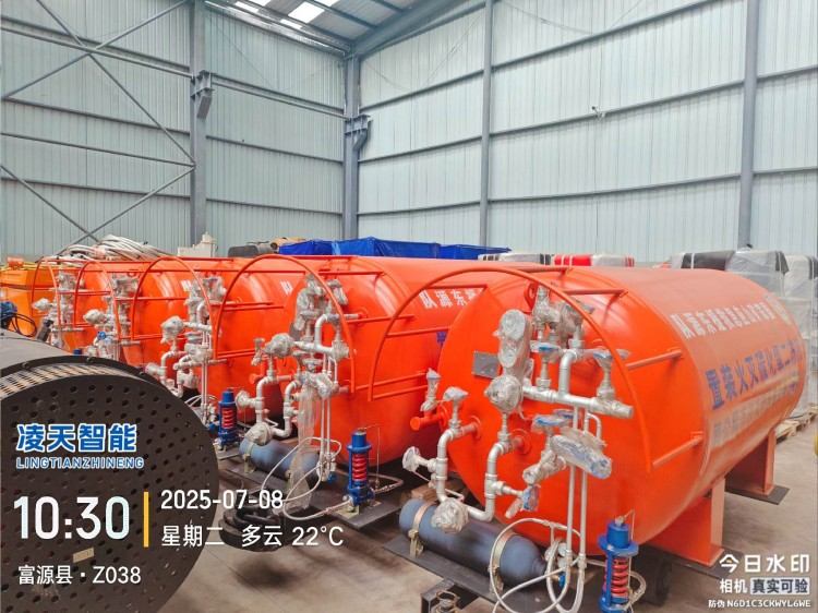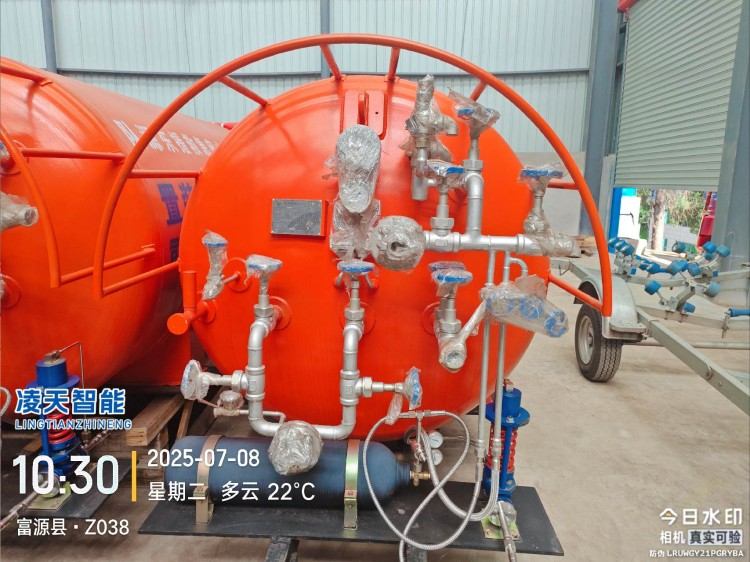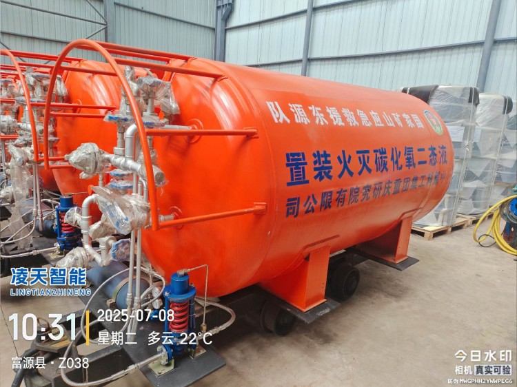 液态二氧化碳灭火装置,采用平板车为运载平台,搭载液态二氧化碳灭火模块,采用液态二氧化碳为灭火剂,运输至井下火区近附,经自增压调控系统实现罐内稳压,并通过远距离输送管路将液体从罐内向密闭火区喷射,利用其急速膨胀气化和吸热效率高的物理特性,可实现惰性降氧,吸热降温,吸附阻化等功能,从而可快速进行井下煤层自燃火灾的预防与扑灭等。