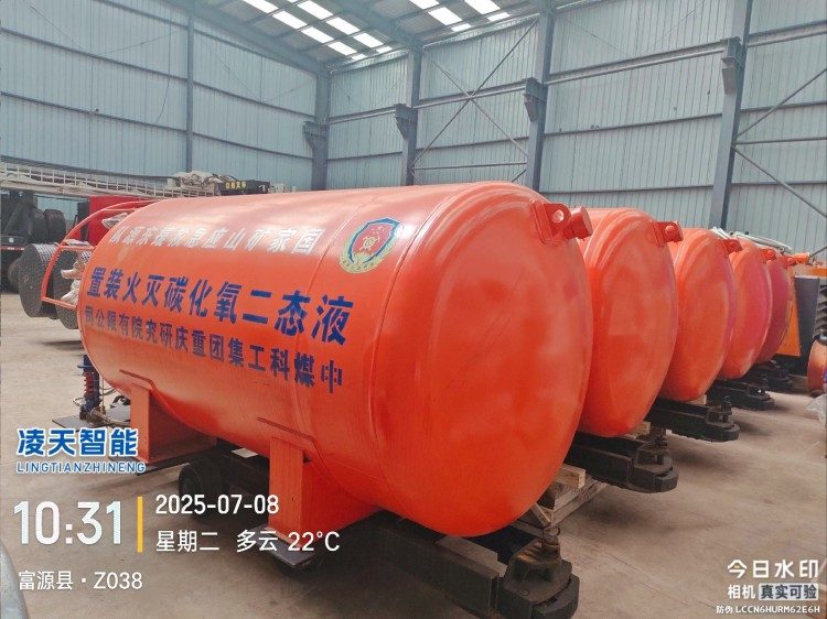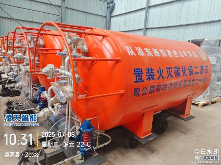 液态二氧化碳灭火装置,采用平板车为运载平台,搭载液态二氧化碳灭火模块,采用液态二氧化碳为灭火剂,运输至井下火区近附,经自增压调控系统实现罐内稳压,并通过远距离输送管路将液体从罐内向密闭火区喷射,利用其急速膨胀气化和吸热效率高的物理特性,可实现惰性降氧,吸热降温,吸附阻化等功能,从而可快速进行井下煤层自燃火灾的预防与扑灭等。