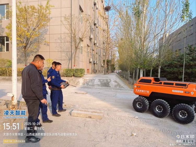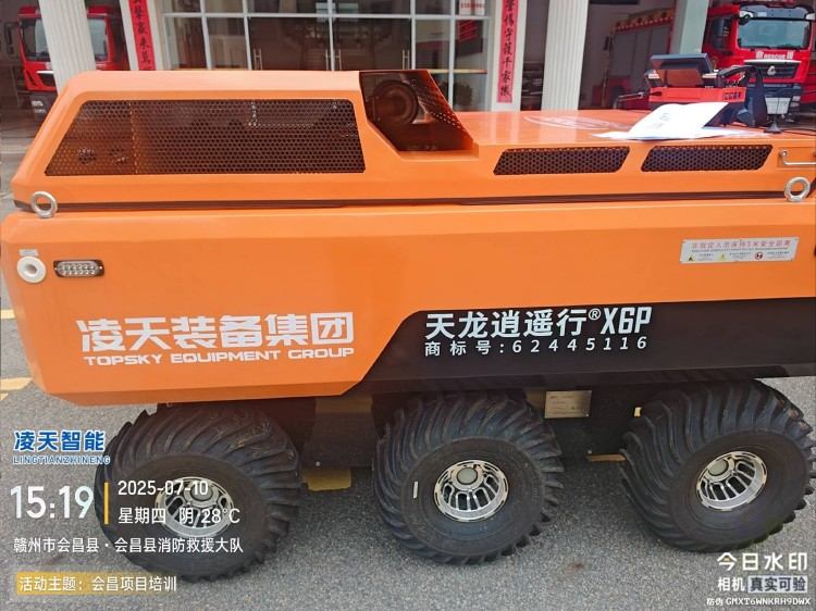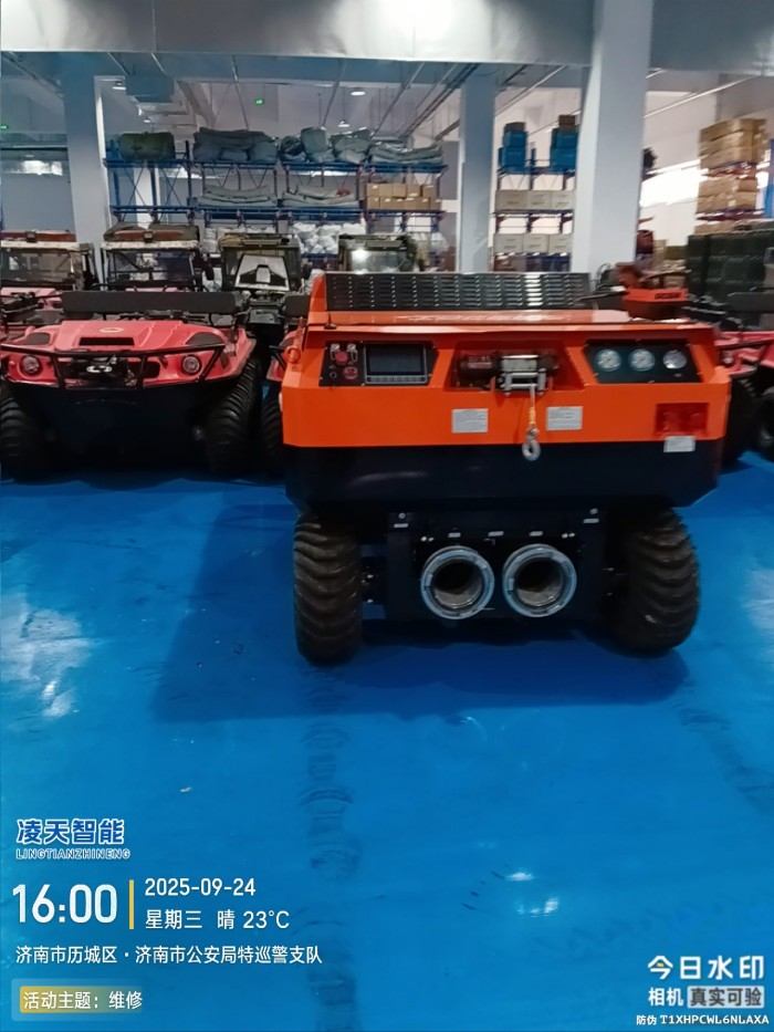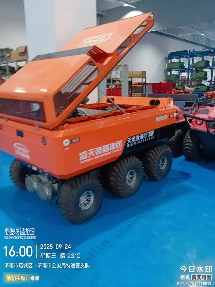 水陆两栖 采用6×6轮式+履带底盘,液压驱动,水陆两栖,可全地形行驶。可在水上漂浮行进,适合多种救援场景,轮胎+履带两用底盘(履带可快速拆装)。