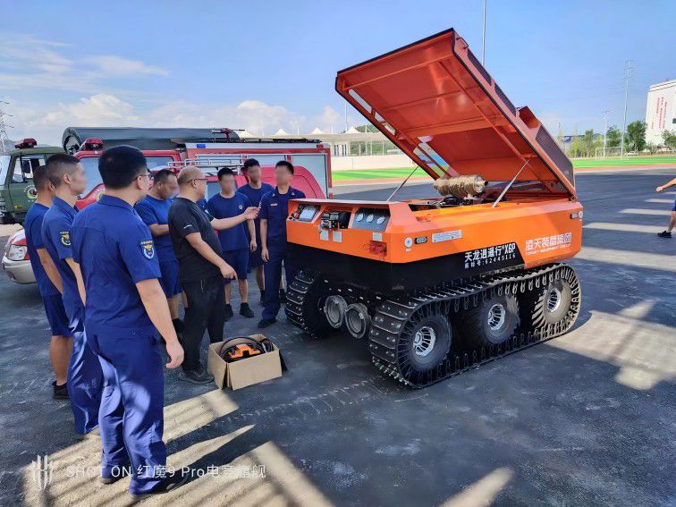 RXR-Q165D 排涝破拆一体化机器人采用柴油机为动力,液压系统驱动,使用远程无线遥控操控。排涝破拆一体化机器人可用于城市车库、地铁站、隧道、涵洞、城市狭小道路等环境的排涝救援。当城市发生洪涝灾害,导致地下车库、地铁、隧道等蓄水严重时,排涝破拆一体化机器人可实现快速排洪救援。本产品具备排水、音视频侦察、水中漏电侦察、灾区环境侦察等功能。本产品配套的水带车可匹配多种规格水带收卷,收卷后水带可拆卸。机器人配备的水泵具有排污、放水、检修等大口径端口设置。