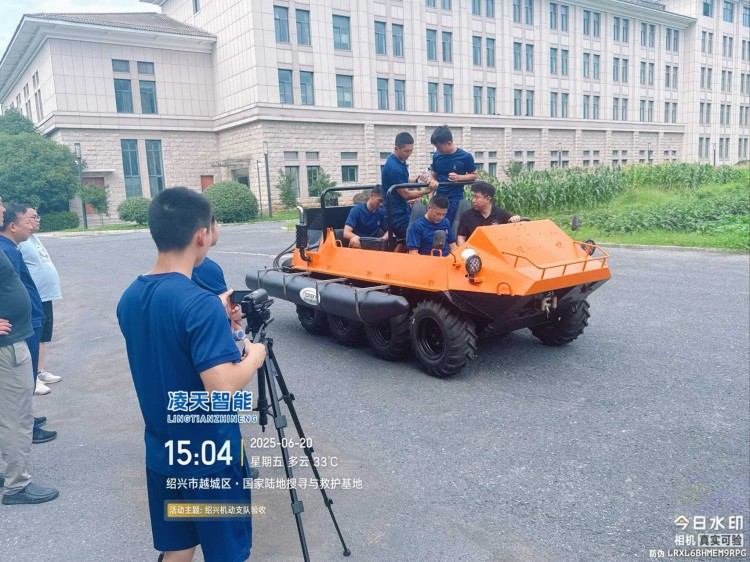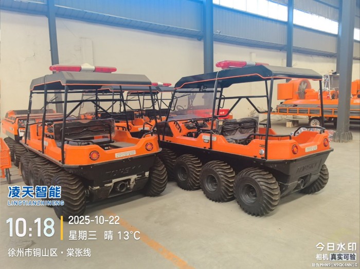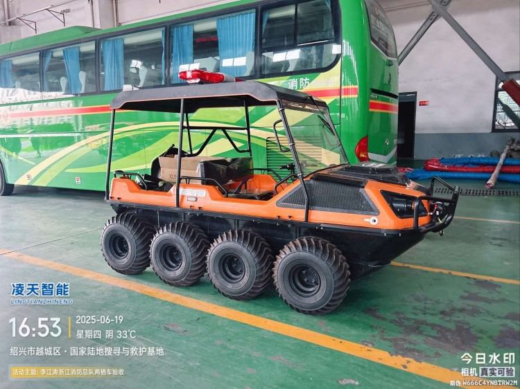 针对水灾频发的地区,水域救援任务必不可少。但往往洪涝灾害、城市内涝往往伴随着恶劣的天气和崎岖的地形,冲锋舟需要多次搭载不同交通工具并数次转移,水陆两栖全地形车可以轻松通过水淹、泥泞、沼泽等环境,无需人力搬运,实现陆地驾驶和水中行走自由切换,以最快的时效抵达现场实施救援。